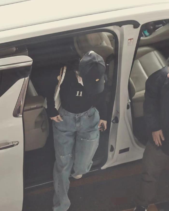 画面中,赵丽颖身穿一件黑色短款紧身上衣,下身宽松的破洞浅色牛仔裤搭配白色运动鞋,头戴棒球帽,整个装扮随性又不失时尚感。