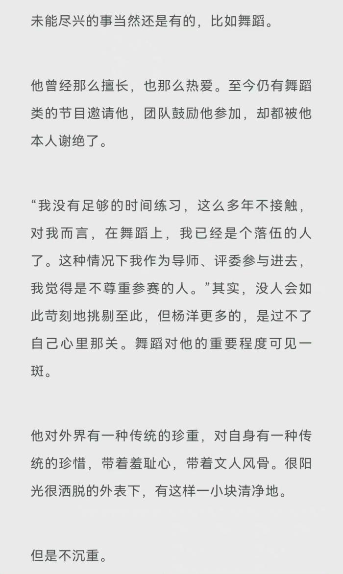 杨洋表示:“我没有足够的时间练习,这么多年不接触,对我而言,在舞蹈上,我已经是个落伍的人了。这种情况下,我作为导师、评委参与进去,我觉得是不尊重参赛的人。”至今仍有舞蹈综艺邀请杨洋,杨洋的团队也鼓励他参加,但他都谢绝了。