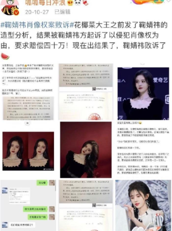 结果被鞠婧祎方以侵犯肖像权为理由,要求花椰菜大王赔偿鞠婧祎方40w,但是法院判定的是鞠婧祎方败诉。