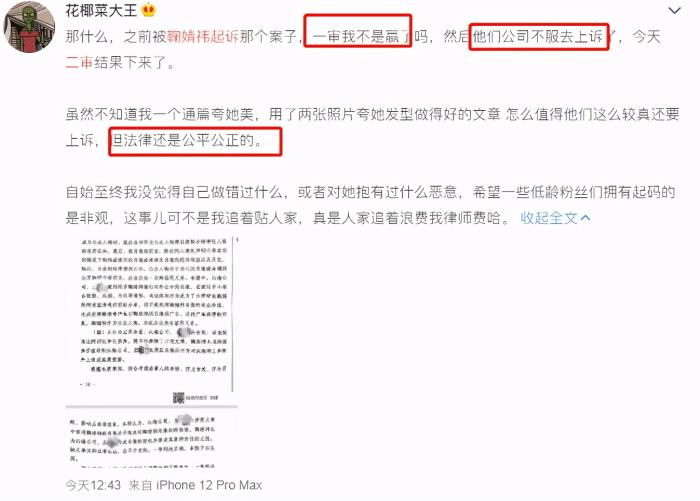 要说到鞠婧祎为什么要告这个网红呢?在2020年网红花椰菜大王写了一篇分析造型的文章,其中就是以鞠婧祎的一个红毯造型作为出发点,教大姐如何打造高颅顶的造型,在这篇文章中花椰菜大王有推荐产品。这篇文章话语是比较温和的,并没有言语侮辱艺人等。