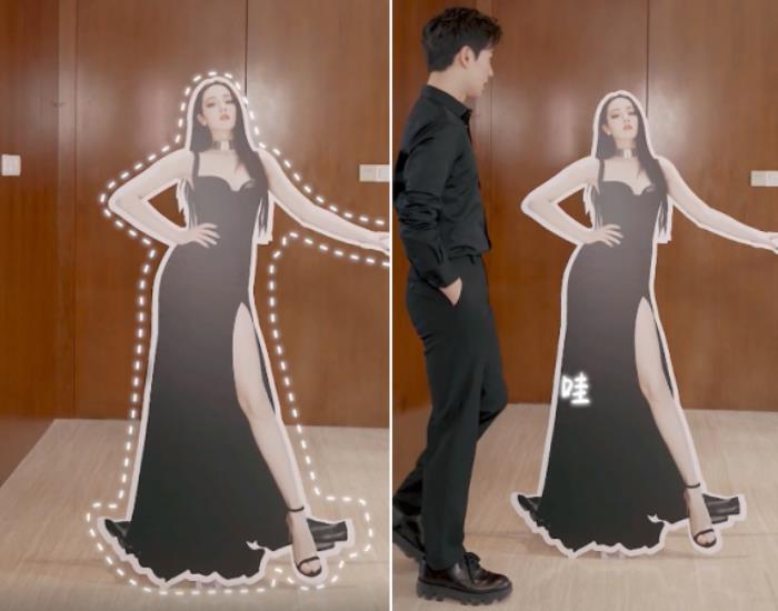 图片中看出,室内放着一个迪丽热巴的人形立牌,路过立牌的杨洋穿着一件黑色衬衫搭配黑色西服裤,脚踩一双酷飒的靴子,和剧中男主相似的装扮,显得清爽利落。简约清爽的造型凸显十分优越的身材比例,遇到热巴的立牌,他绝不吝啬对着立牌夸赞热巴的美丽。