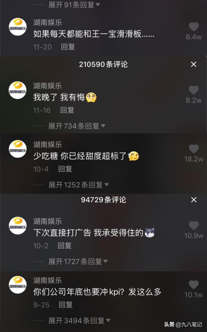 在某一平台中,王一博会发布一些小视频。要么是“金主爸爸”安排的,要么就是王一博的“沙雕时刻”。有趣的是:几乎每一天动态的评论区,都会出现湖南卫视的官博——湖南娱乐。