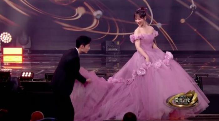 帅哥靓女齐齐上台,看起来十分登对,肖战为杨紫拾掇裙子还出现了个搞笑的梗儿,看来绅士也不好当,一不小心就成了喜剧演员。