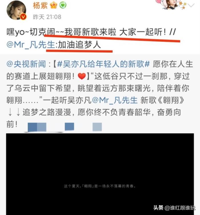 如图所示,近期在吴亦凡新歌发行不久之后,杨紫转发宣传,并且亲切称呼吴亦凡为“我哥”。