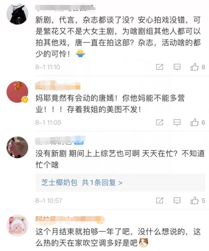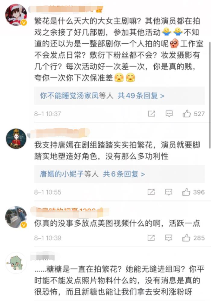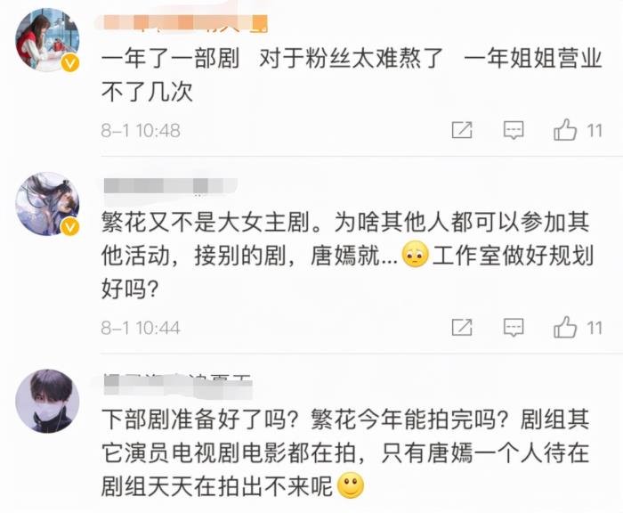 从去年的8月份开机,到今年,《繁花》已经整整拍了有一年多的时间了,而唐嫣在今年的曝光率极少,每一次粉丝在期待能见到新鲜的糖糖,但是工作室发布的行程皆是唐嫣在剧组拍戏,公开活动少的可伶,其工作室也是一隔好长时间没有任何物料,惹粉丝不满。