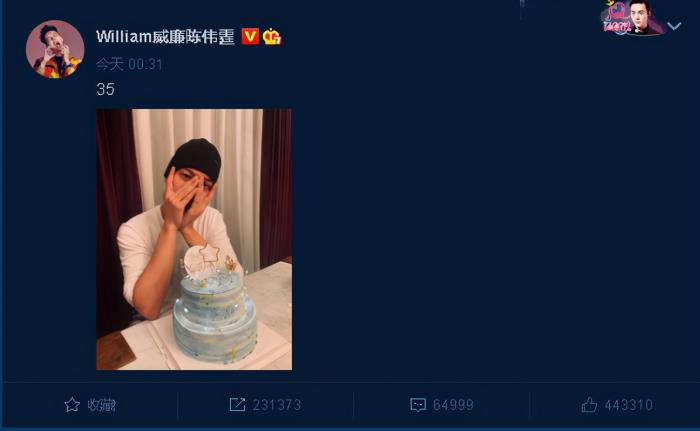 11月21号的凌晨0点31分,陈伟霆发布了自己过生日的照片,还配了35这两个数字。
