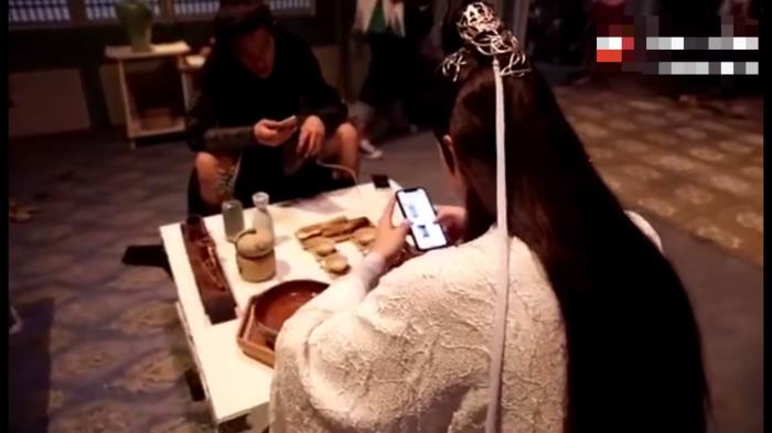 曝光的画面中,王一博身穿《陈情令》剧中造型,正坐在片场休息,肖战就在他的对面。如同普通人一般,休息时他也刷起了手机。