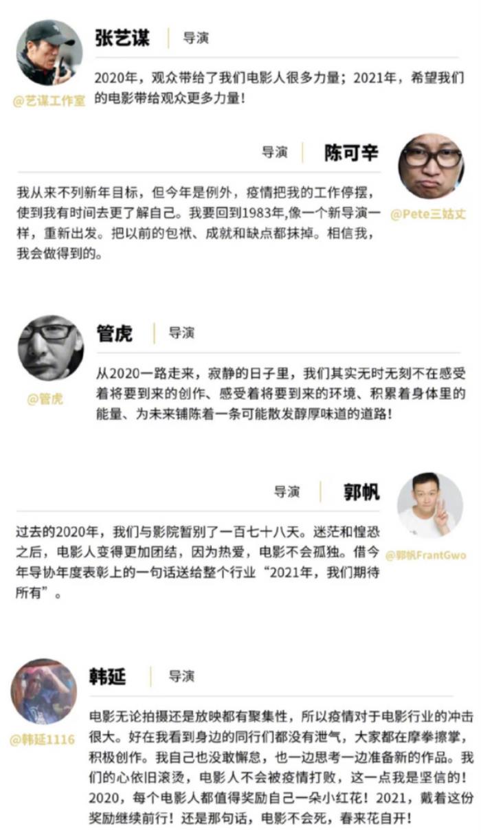 大多都是感悟过去,展望未来,其中《夺冠》的导演陈可辛写得最“文艺”,他表示希望自己能回到1983年的状态,像一个新导演一样重新出发。