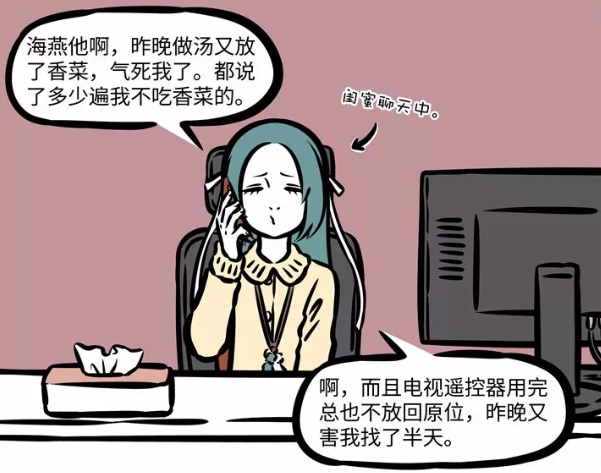 让我们从头开始。这一天,经纬和闺蜜通电话,聊的时候透露了一些自己的秘密。比如她不吃香菜。哇,经纬的头发看起来和香菜没那么大区别。我不喜欢香菜。此外,我还谈到了夫妻生活中的一些事情,比如我老公用了电视遥控器没有放回去。原来他们家平时看电视是为了休闲娱乐。另外,从这一点可以看出,经纬家是她老公煮的,海燕当之无愧的好老公。