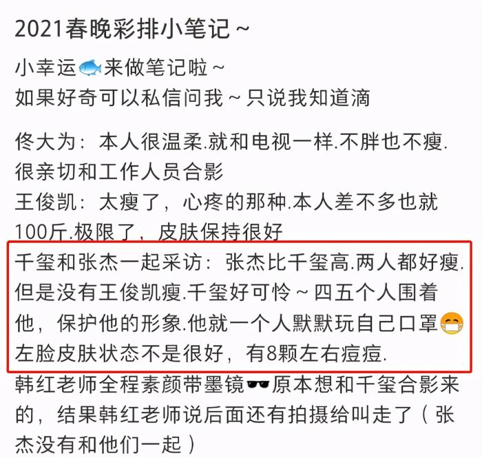 近来春晚彩排为吃瓜网友提供了不少看点。2月7日,有网友晒出彩排小笔记说易烊千玺左脸长了8个痘痘,团队为了保护他的形象还把他团团围住,一下子又让人想起来彩排进场前易烊千玺被嘲讽“普男”的形象。