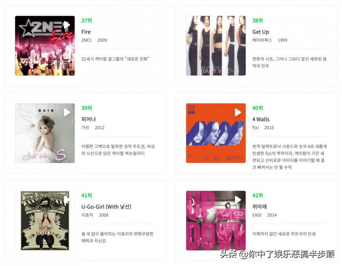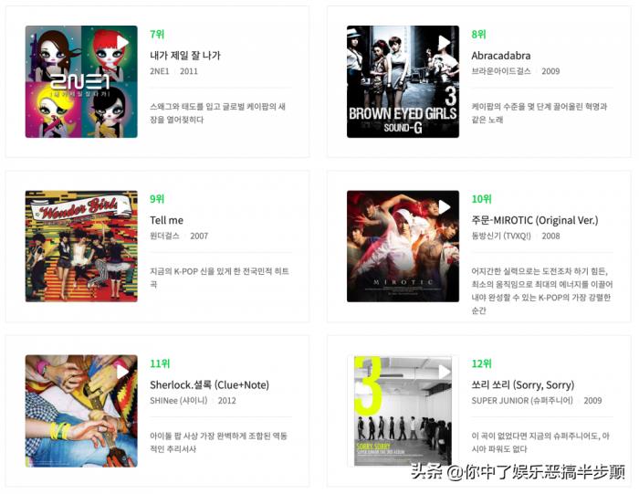 第13到18分别是:BLACKPINK《DDU-DU DDU-DU》、S.E.S《('Cause) I'm Your Girl》、IU(李知恩)《Good Day》、李孝利《10 Minutes》、H.O.T《Candy》(韩团始祖)、KARA《Mister》。SM娱乐在中两元,这样的成绩在韩国真的可以说还有谁!