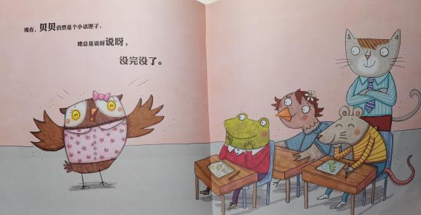 贝贝是一只小猫头鹰,她是个小话匣子,总是说呀说的,没完没了。