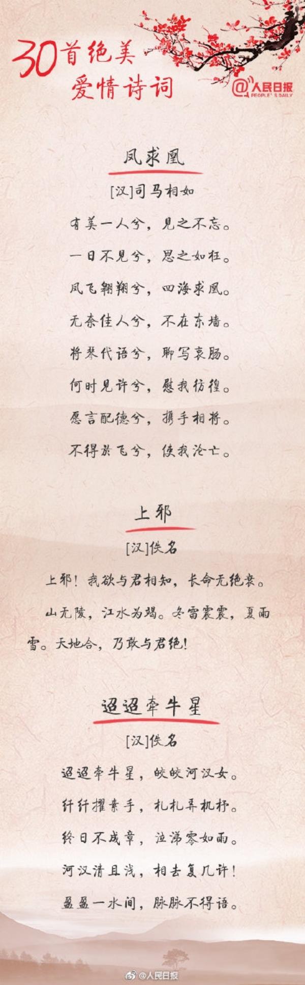 人民日报官微总结了30首爱情诗词,一起来看看古人们是如何表白的吧: