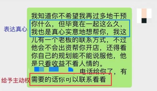 这样,不仅让对方意识到她对于自己人生、事业的重要性,也让对方看到了她在分手后,学会了为他人考虑的转变。