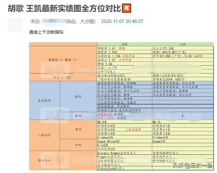 至于主流奖项、一线杂志封面和品牌代言,胡歌在数量方面占据比较大的优势,粉丝留言表示这是单方面碾压,引发一片热议,有声音就称:“五年连扑的古偶咖不该和正剧演员比。”作为回击,胡歌粉丝则赞扬胡歌是业内认证有奖在手的视帝,是一番入围戛纳的2019文艺片票房冠军。甚至,有言论根据此数据表直言不讳说胡歌吊打王凯,着实令人吃惊。