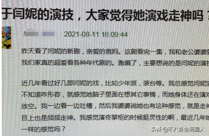 可随着闫妮的几部新片播出,网友对闫妮“变脸”的事更多的仍然是惋惜,《亲爱的爸妈》里,她似乎就开始不会演戏了。常常让观众觉得她在戏里走神。