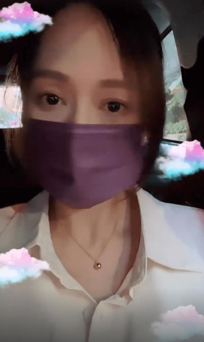 陈乔恩在车上戴着紫色口罩自拍,状态看起来十分不错!