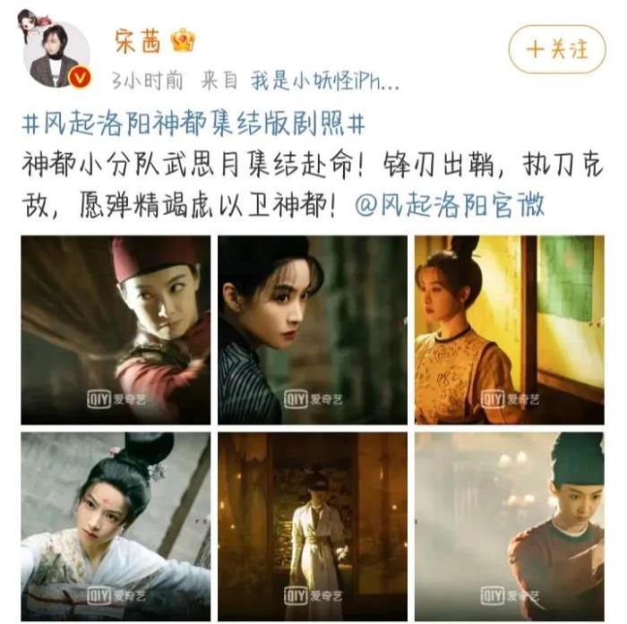 紧接着宋茜也发布了微博,六宫格剧照,配文“神都小分队武思月集结赴命!锋刃出鞘,执刀克敌,愿殚精竭虑以卫神都!”好燃!好飒!有木有!