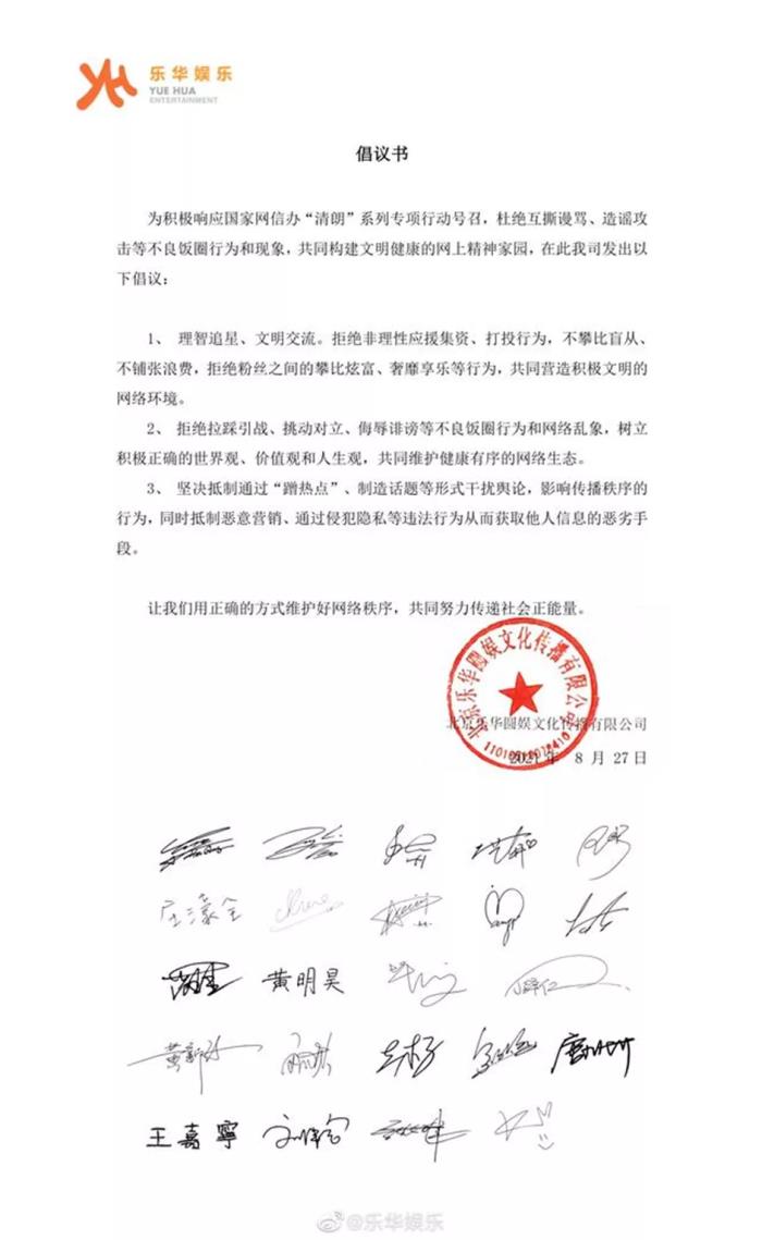 4天前,乐华娱乐在社交媒体上发表杜绝互撕谩骂、造谣攻击等不良饭圈行为和现象的倡议书。旗下艺人韩庚、王一博、孟美岐、吴宣仪、唐九洲、黄明昊等在倡议书中签名,并转发了该倡议书。