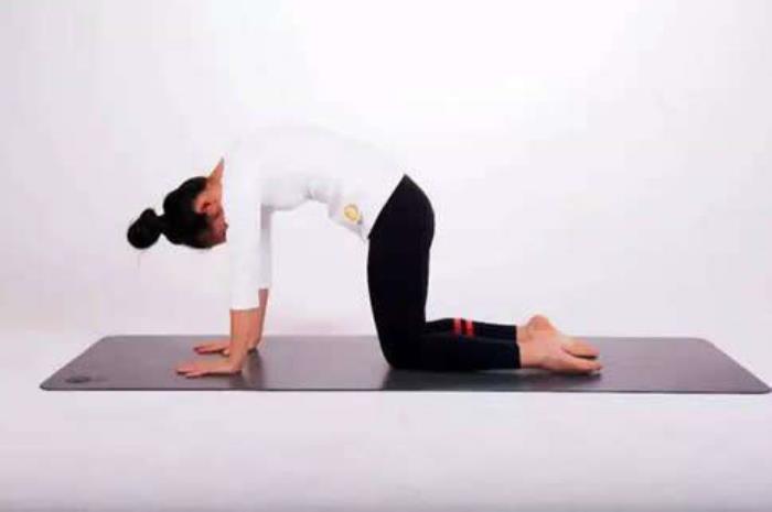 四角板凳式跪立于垫子上,双手放于双肩的正下方,双膝放于坐骨的正下方绷紧脚背贴地或者回勾脚掌双手十指分开,吸气脊柱保持向前延展,呼气卷尾骨让脊柱一节一节向上高高的隆起双手有力推地,眼睛看向肚脐双手双脚有力地去推地吸气坐骨向后向上张开,腰椎向下脊柱一节节向前向上,到达颈椎时抬头,重复几组呼吸即可