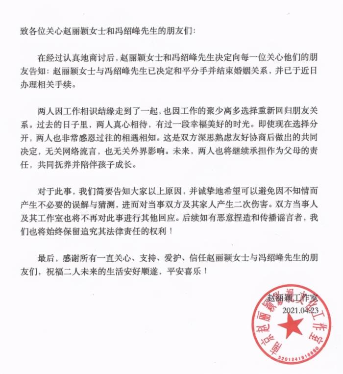 到了下午的时候,赵丽颖也发了同样的文案官宣离婚消息,至此,网络上关于此事的热议再上高峰,相关话题已经是高居热搜榜榜一长达两个小时了。而经过这么久的发酵,两人离婚的消息早已是人尽皆知。