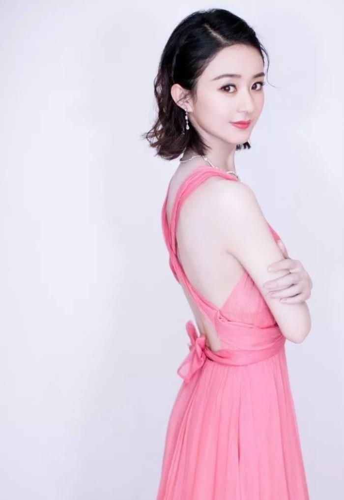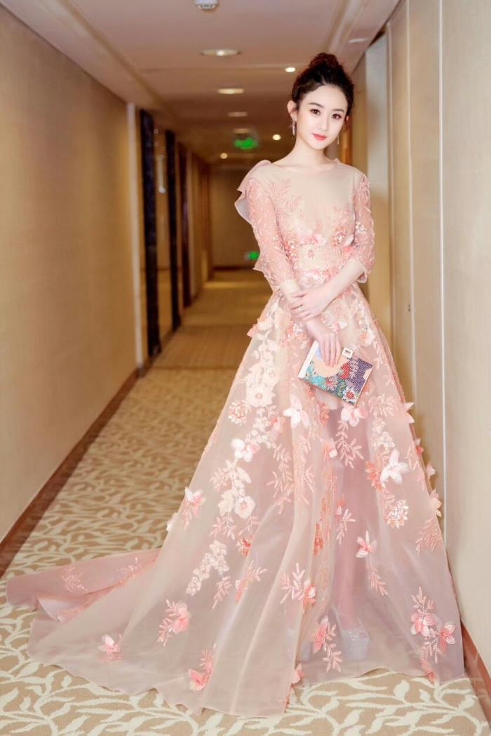 一条白色和粉色渐变的礼服裙,曳地长裙优雅自然不用多说。