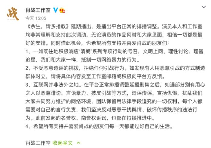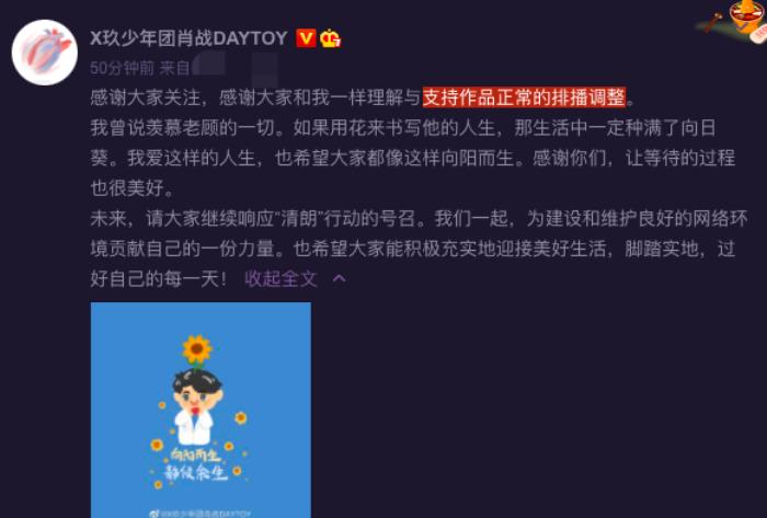 随后,杨紫和肖战也发文证实了这一消息,并发文表示希望粉丝理性看待,支持作品正常的排播调整,静候佳音。