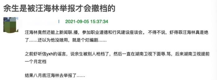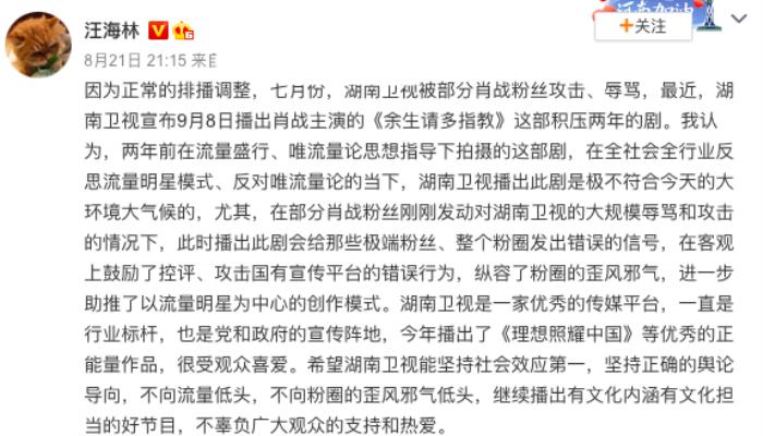 8月底,汪海林发文称之前《余生请多指教》因为传出改档的消息,芒果台被许多肖战粉丝攻击辱骂,他认为这部剧拍摄时流量盛行,但现在这种风气是极其不符合当下的大环境。
