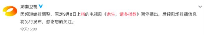 9月5日,由杨紫和肖战主演的《余生请多指教》正式官宣改档,延缓播出。