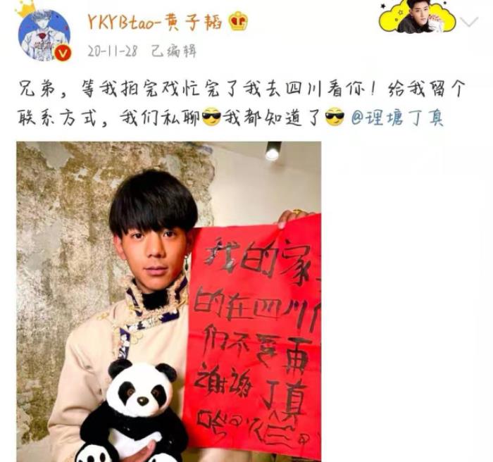 黄子韬曾经发微博说自己忙完这一段时间就去四川看丁真,然而还没等到他去看丁真,丁真就先走到他的面前来了。