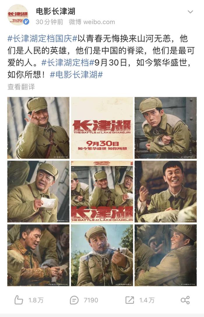 电影《长津湖》在官微发文:“以青春无悔换来山河无恙,他们是人民的英雄,他们是中国的脊梁,他们是最可爱的人。如今繁华盛世,如你所想!”并宣布电影定档9月30日。