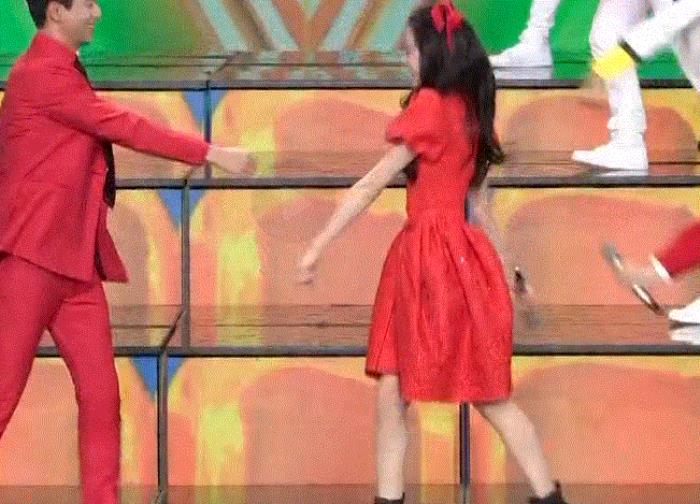 我们可以看到,迪丽热巴、李现、刘浩存、陈立农身穿红色系衣服,看上去非常喜庆,而迪丽热巴和刘浩存牵手亮相,看上去很像姐妹,但他们四人跳舞后,这个节目的画风却突变。