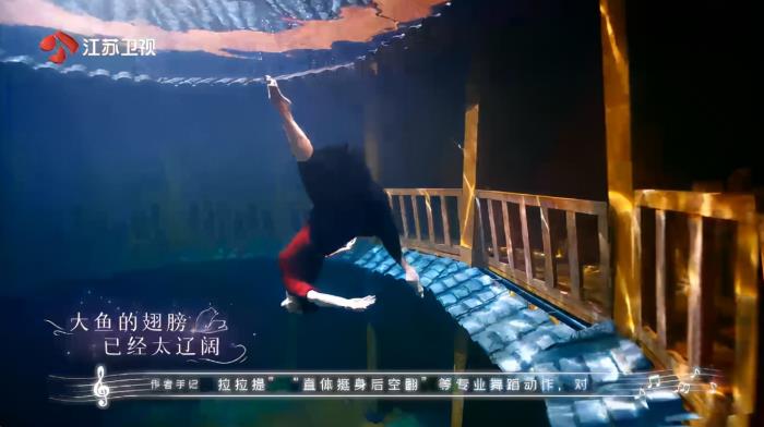 水下舞蹈的首艺,其要义首先是“舞蹈”,而非只是“水下”,这段由青年舞蹈家,国家一级舞蹈演员张娅姝表演的水下舞蹈,包括了“踹燕”、“单腿挂”、“拉拉提”、“直体挺身后空翻”等专业舞蹈动作,对表演者的力量、柔韧、平衡感要求极高,在水下表演是,演员还需要对面部表情进行严格的管理,努力使水中的情绪张力接近陆地空气中的状态,其比起舞蹈时间最长达到1分钟。在舞蹈功力的支撑下,本段演绎的拍摄也尽量使用长镜头,避免碎片化拼接,从而尝试在舞蹈水准和拍摄水准方面突破新的标准。