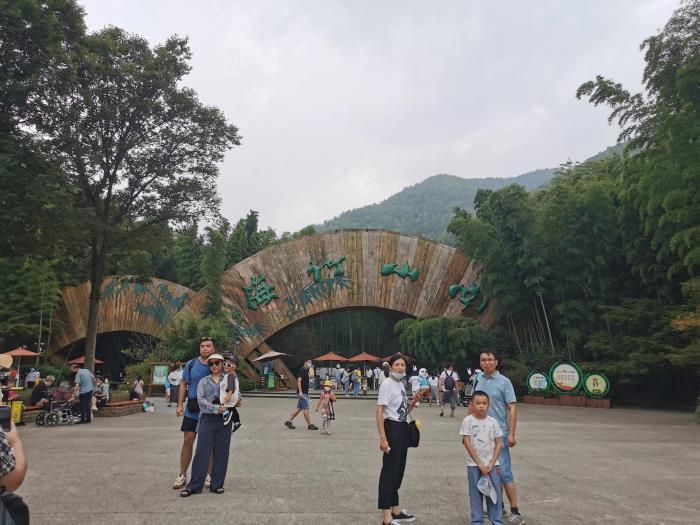 上山之后一路步行,路过鸡鸣村历史文化街区,还有竹文化园,舞狮表演,约30分钟后到达熊猫馆。