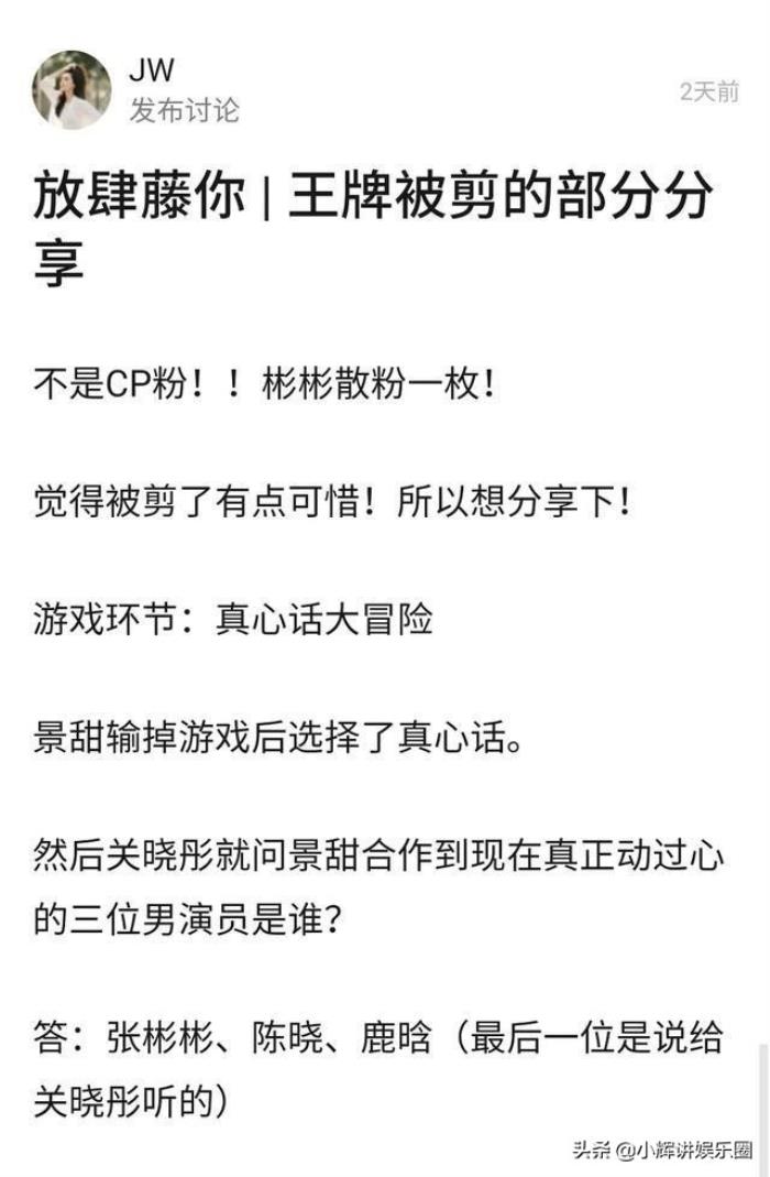 在加上有人扒出,在上周五的《王牌》中,景甜输掉了比赛,被关晓彤问景甜她最中意的男演员。要知道王牌的规则可是,一问就是三位,而节目中的关晓彤却问的是两位,而且这个“两位”与前后的音量对不上,疑似后期配音,就有网友扒出,原来是三位里景甜说的竟有鹿晗,疑似后期剪掉了。