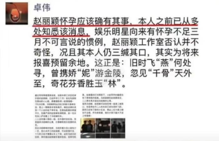 2018年8月,卓伟爆料赵丽颖怀孕,随着网上消息愈演愈烈,赵丽颖本人出面回应,“不知道说啥了,我给大家劈个叉吧”,意思很明显,就是否认了怀孕。(这一波操作,也是赵丽颖路人缘下降的源头之一。)