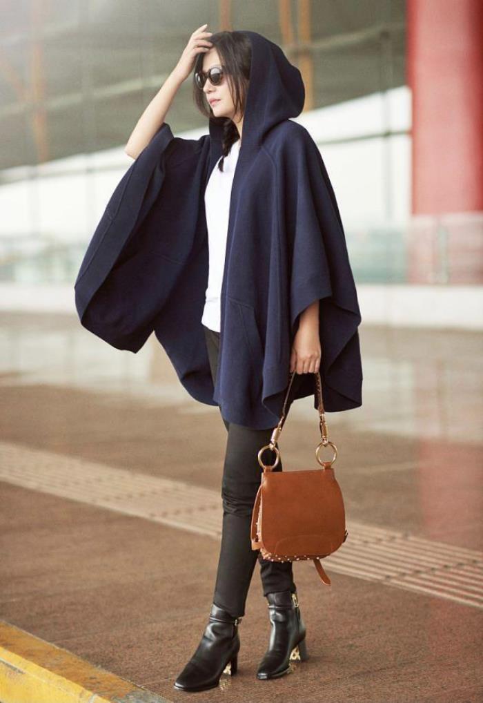 这套就是简单的出行装了,简约百搭的白T+黑色牛仔裤+黑色高跟短靴+藏蓝色的“斗篷”外套,就是非常日常的的穿搭,明星们经常在机场被拍,这也是为什么他们在外面都带着一副墨镜的原因,不仅可以修饰,还能避免一些问题。