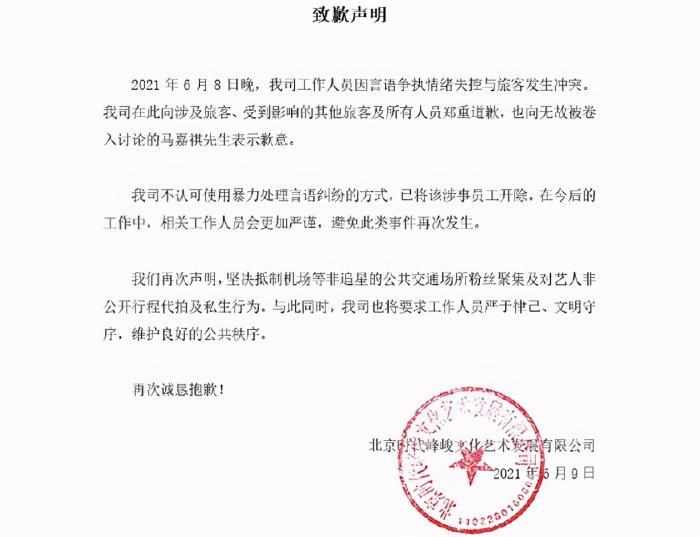 马嘉祺让另一个助理去劝架,但这个助理不敢离开马嘉祺身边,怕白衣男子的同伴会揍马嘉祺。6月9日上午,时代峰峻发微博道歉,表示工作人员因言语争执,最终导致情绪失控,与旅客发生了冲突。