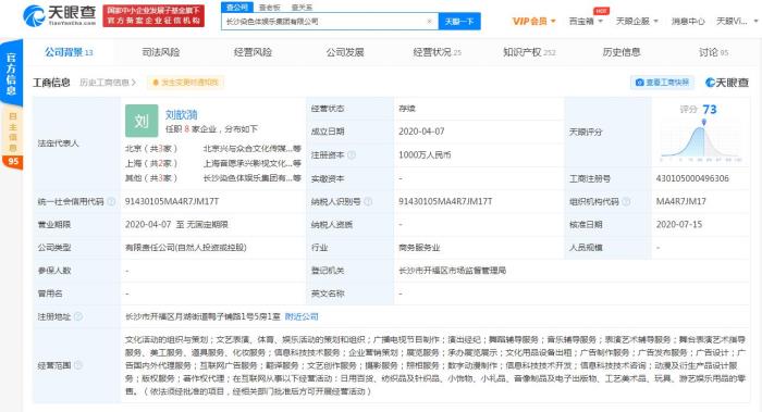 天眼查App显示,染色体娱乐集团关联公司为长沙染色体娱乐集团有限公司,该公司成立于2020年4月,注册资本1000万人民币,法定代表人为刘歆漪,经营范围包括文化活动的组织与策划;广播电视节目制作;演出经纪;舞蹈辅导服务等。股东信息显示,张艺兴为公司第一大股东,持股比例为99%。