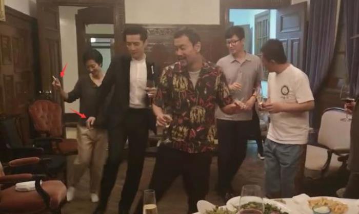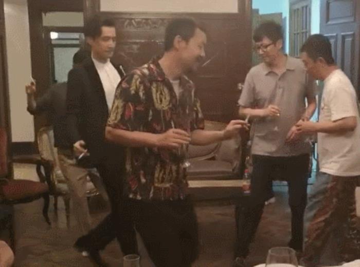 从图中可见,廖凡站C位,胡歌穿着一身帅气西装,桂纶镁身穿休闲装,几个人在室内跟着音乐的节奏跳舞。几个人都是左手拿酒杯,右手拿着一支烟,边喝酒边抽烟边跳舞,笑得可开心了。