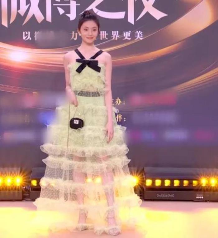 虽然看起来不太高级,但被乔欣穿出了“花仙子”的感觉,十分吸睛。就是造型不太给力,她两边的刘海贴在脸上,显得不太自然且僵硬。
