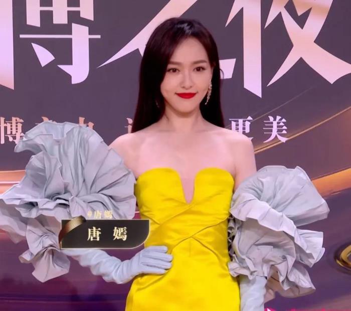 唐嫣的礼服完美融合了2021年的流行色:黄色和灰色。