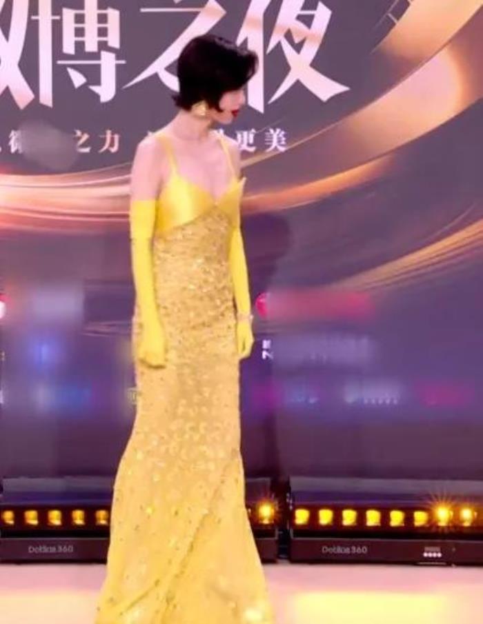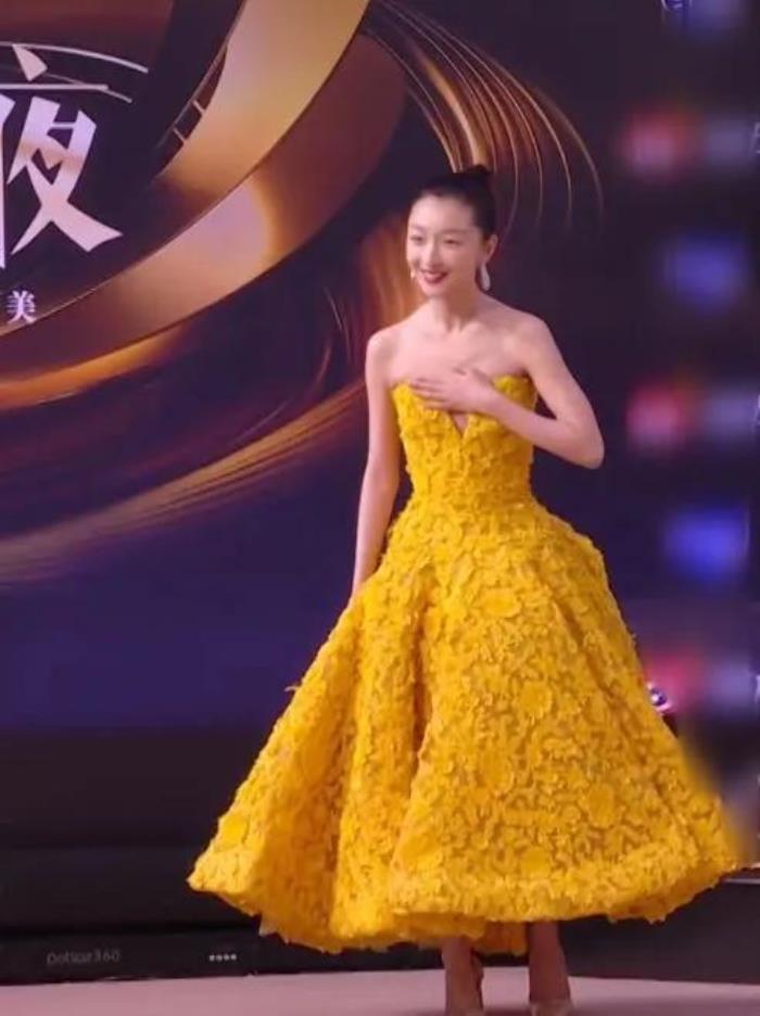 关晓彤一身明黄色抹胸短裙,光彩动人,造型很大程度突出了腿长的优势。