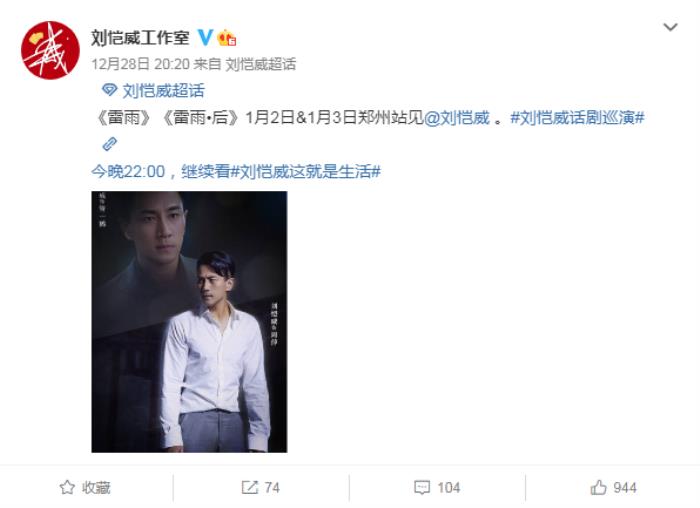 28日,刘恺威工作室还在微博为刘恺威的话剧巡演做宣传。