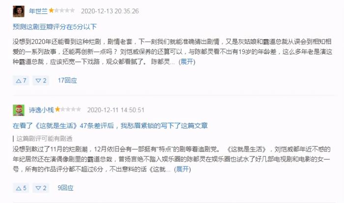 目前,刘恺威和陈都灵新剧《这就是生活》还没有在某瓣开评分,但是从网友的一些短评中可以看到,很多网友都给了一星差评,并表示评分将会在5分以下。