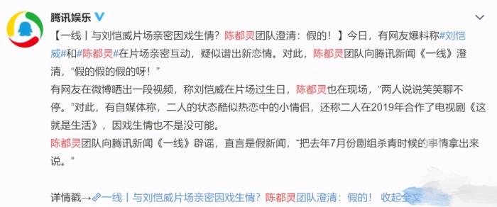 有媒体便就此事求证了陈都灵方,陈都灵团队则澄清表示:“假的假的假的呀”,并透露两人的亲密视频是刘恺威在片场过生日时,陈都灵也在现场,因为亲密视频而传出现身民政局领证结婚的消息,则是剧照,剧中两人饰演的是一对情侣,有现身民政局领结婚证的戏份。