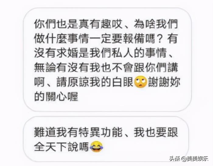 当时气得陈乔恩打了一大段文字回应粉丝,表示:“有没有求婚是我们私人的事情,无论有没有我也不会跟你们讲啊”。