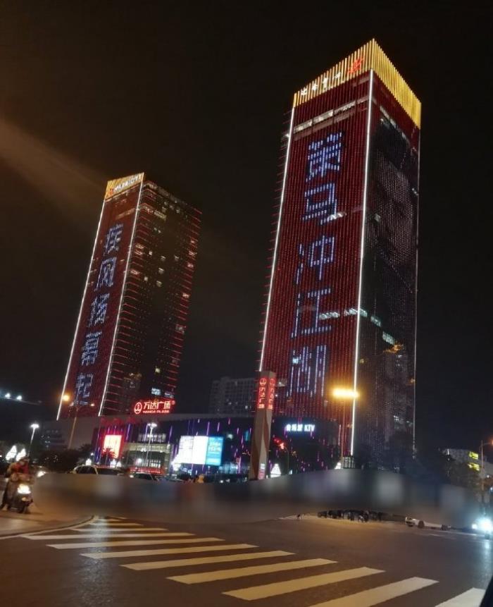在高高的两栋大楼外面,一整面墙都是疾冲的形象,远远望去确实非常显眼。同时画像也和藏头诗轮换,诗也很应景:疾风扬幕起, 策马冲江湖。藏头诗不仅霸气,而且把疾冲在《狼殿下》中的人物性格,很形象的形容了出来,真的很有才了。