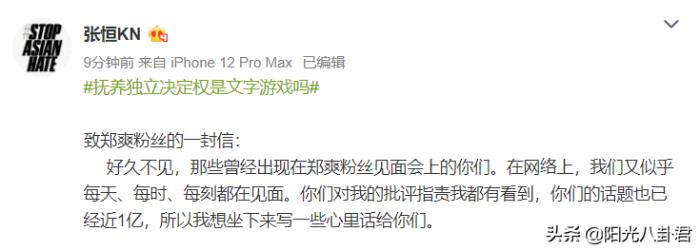 不久前,张恒突然在微博上再次发出长文,这次,他以“致郑爽粉丝的一封信”为主题,上演了一场单方面与郑爽粉丝隔空对话的场景。