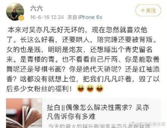 就连作家六六,在2016年吴亦凡爆出丑闻时,亦曾为他站台,“本来对吴亦凡没好没坏的,现在突然就喜欢他。长得这么好看,还要哄人,陪完睡还要被背叛。女的也是贱,明明是炮友,还想睡出个青史留名。是青楼的青……”